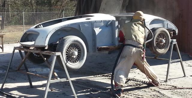 When I finally take the body off the car for underbody painting there will be more grit on the heater shelf, under and around the engine, and on the suspension parts. It would have been better if the bonnet and boot lid were in place to keep most of the grit out of the boot and engine bay, but that didn't bother me much with the body coming off anyway. For grit and dust on or inside the car, doing it outdoors may not make much difference (but it would keep the shop clean).