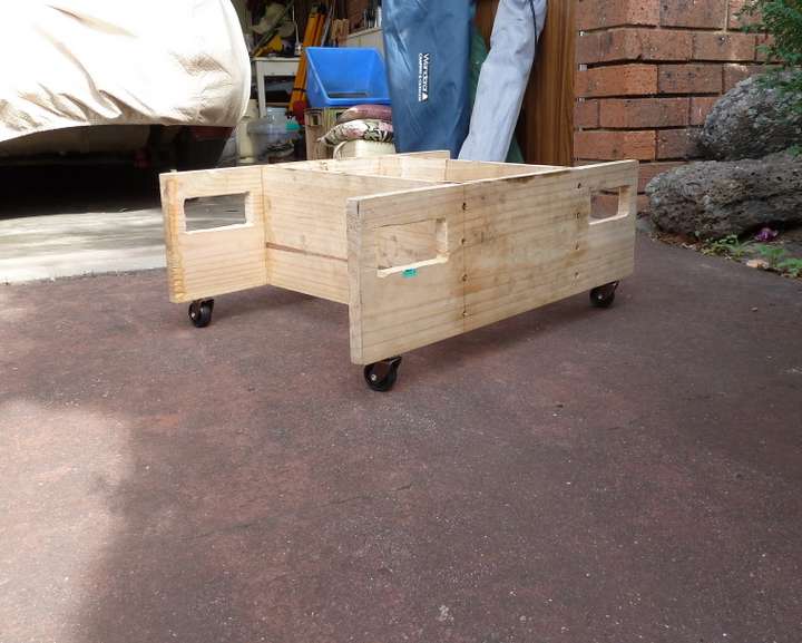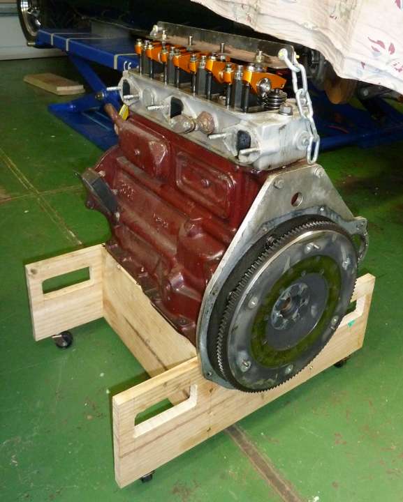 I used 19 mm x 190 mm dressed pine board with (4) 40 mm dia 60 kg rated stem castors. I needed to also notch out the carrier on the crankshaft line to allow for the tapered protrusion on the rear of the sump on my 1800 engine (19mm board would not fit between the back plate and sump). Having castors on the carrier makes it a one man job to move around the garage".