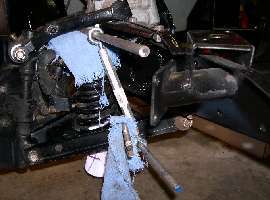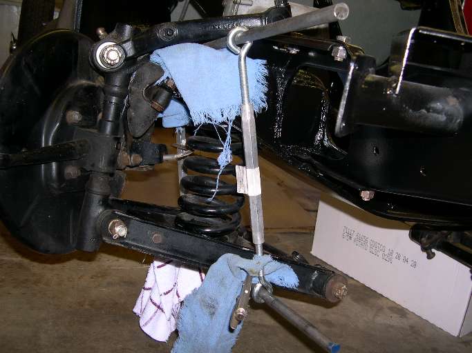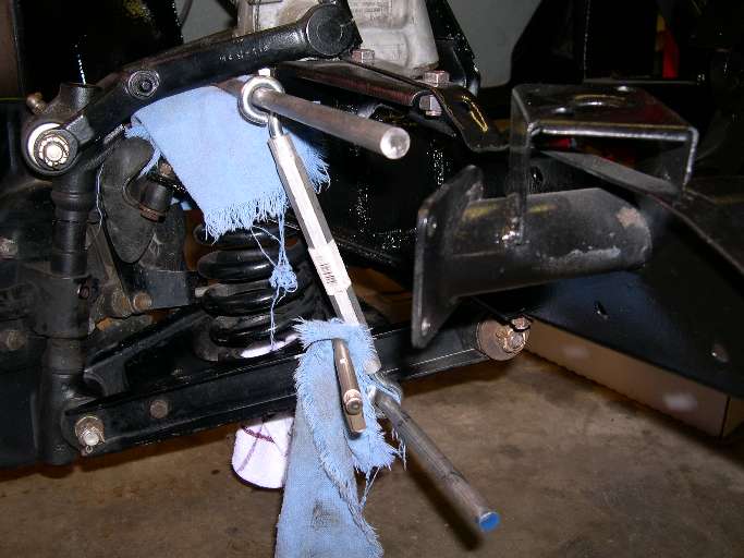 Vice grips will hold the lower rod in place and I discovered that a long punch was needed to line up the holes as the spring was getting compressed. I suspect that a long bolt could replace the upper rod so as to keep the turnbuckles close to the spring tower/shock. It does seem to work well though.