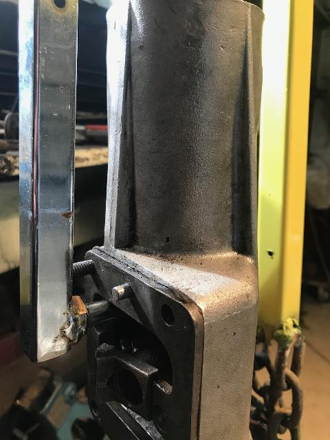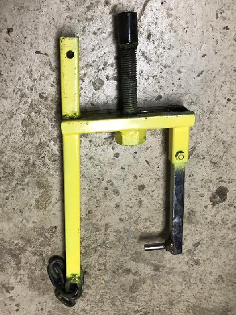 "One of our local MGA gurus (Jim McKenzie) came up with this puller for the rear housing of an MGA gearbox (1600 type). He decided to make it after overhauling the gearbox shown. The pin that goes into casing where the remote control attaches could have been a bit of flat steel but he had the piece of HRS with a bolt already welded, so he used it".
