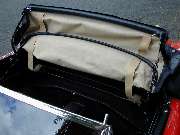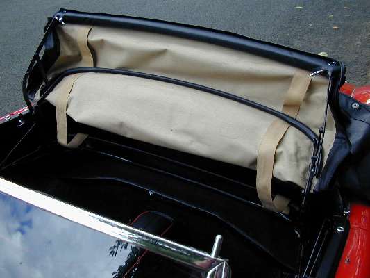 Original style 1500 single window top (photos compliments of Walter Tange). There are no screws through the fabric at the rear bow, but there are original style fabric straps inside running from the front bow back to hold the rear bow in position. The folding frame was originally painted tan with the fabric wrap on the bows being the same color as the inside of the rag top (usually tan). The black frame and wrap makes a nice picture, but is not original.