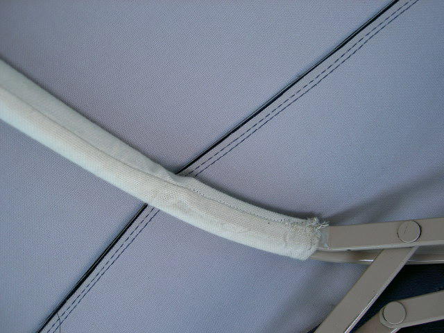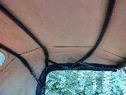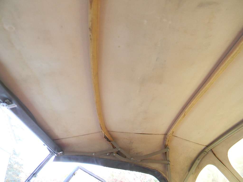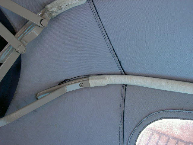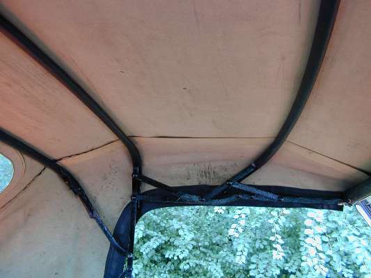 Here are pictures of the listing installed on the rear bow. I don't know if it was ever standard on the rear bow, but I have seen pictures of listing being just a wrap on the bows without bein attached to teh canopy. That is, just a decorative cover. My understanding is that when it was original issue it was sewn into the canopy to prevent wind slap of the fabric, and it was used on the 2nd and 3rd bows only, not on the rear bow. The rear bow either had two web straps from the front or two screws through the fabric. When the listing was used, the frame cross tubes could not be welded to the brackets, because they had to be disassembled to install the canopy with the listing slid over the bows from one end.
