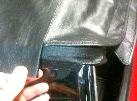 For the problem shown at left, aside from tearing it all apart to shorten the wood bow and re-do the installation, a more immediate fix is to burst some stitching to separate the side flap to allow it to move inward so the side curtains will mate to the windscreen frame. The resulting loose fabric flap is irritating, but not so bad as wind and rain blowing around the side of the windscreen into the cockpit.