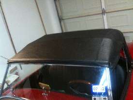 Photo below left shows the side flap curving upward at the front. This results from using the longer wood bow (MK-II style) with the earlier narrower 1500 or 1600 type canopy. Note also that some stitches have been burst to allow the hanging flap to move inward to be flush to the windscreen side post, and that results in the flap hanging down near the front. Photo below right shows the wider MK-II style canopy installed with the correct longer wood bow. Here the side flap lies straight as intended. (Click for larger pictures).