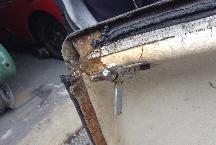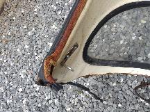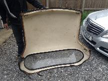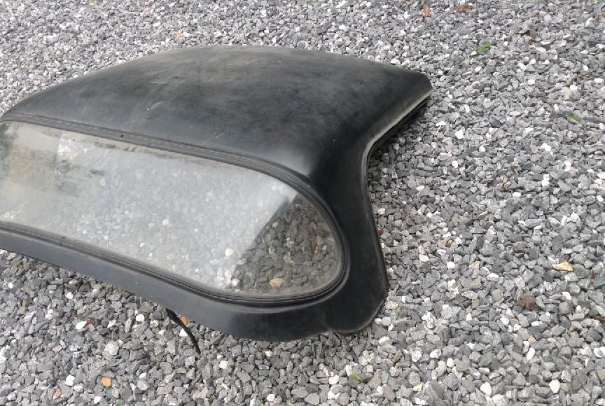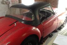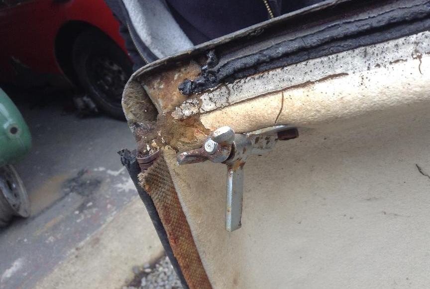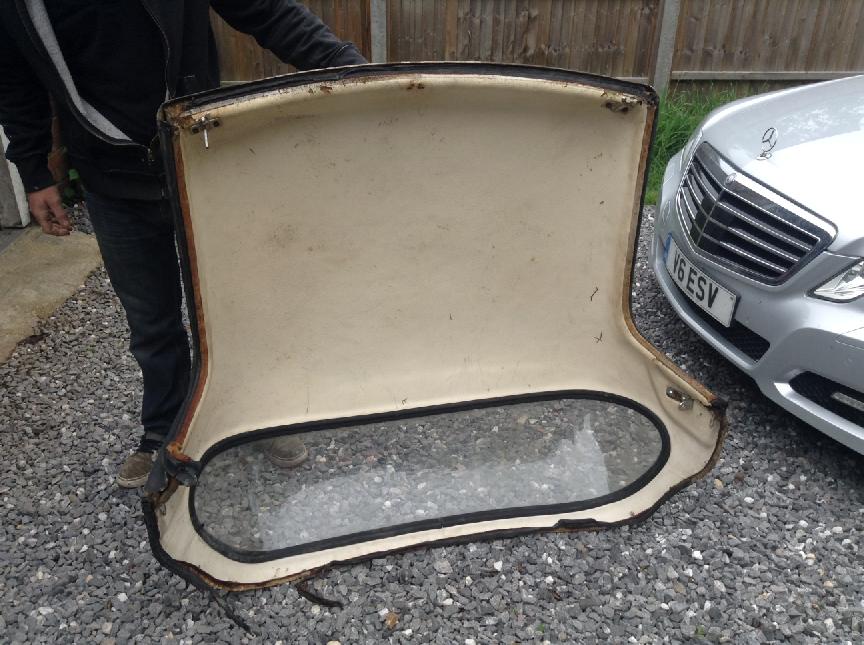 "The owner bought this car (previously UK registered) from France with no history so where and when the hard top joined the car is unknown. It looks like a Universal Laminates top but has no covering, just painted black, and has an integral material over foam type headliner stock to the underside. There are no obvious makers marks or serial numbers. The front fixings do not rely on the posts on the windscreen top rail but hook underneath that top rail.