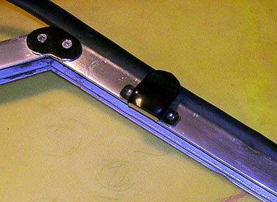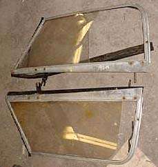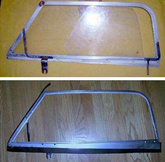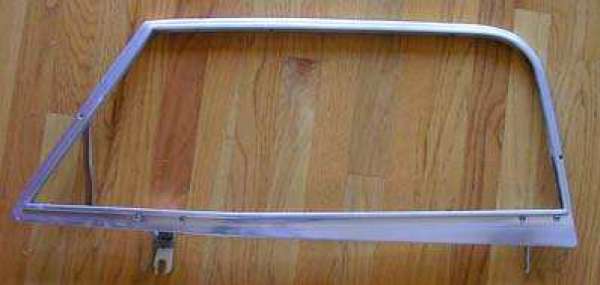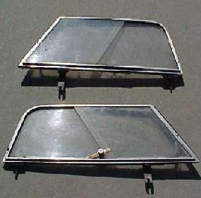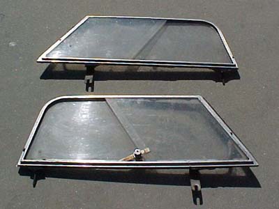 OK these are the real deal, above left, early "Weathershield" aluminum side curtains for the factory aluminum hardtop. Note the brackets in the front and rear attach with chrome screws (the bracket holes are threaded so no nut required). Front plastic piece is fixed, rear piece slides. --- Above right is a set of "late" Weathershield side curtains for the factory Fiberglass hardtop. Note the bottom of the frame is flat, not triangular like the earlier frames. Otherwise they are very similar.