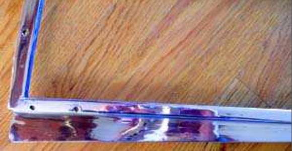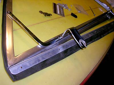 I picked these original side curtains up at an eBay auction for $100 with shipping (a decent price, I've seen them go for as high as $280). They are intact but need polishing, new plexiglass and new rubber seals. The first thing I did was take them to AstroChrome in Van Nuys, CA. Truly, they are "platers to the stars". Celebrity photos adorn the walls, signed by Frank Sinatra, Marlon Brando, Clint Eastwood, Angelina Jolie, etc, thanking "Jesse" for his amazing plating. They took my side curtains and removed all the frozen bolts, screws and brackets, and also removed the old decrepit rubber seals and plexiglass sliders. A few weeks later I returned to find my bare side curtain frames polished to a mirror finish: