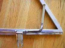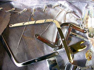 Here are the brackets, kidney-shaped fasteners, original bolts and acorn nuts after chrome plating. Yow! those brackets look good, way better than original (they were painted black before).