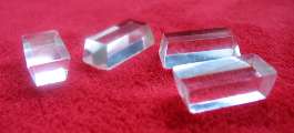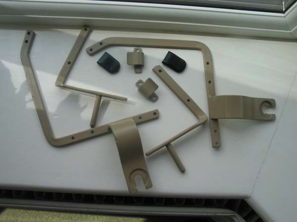 Also the 1" x 1/2" x 3/8" trapezoidal acrylic window knobs (above right). Note the tapering with the smaller area glued to the window. These are copies of original knobs that were fixed to a pair of aluminum Weathershield frames. I'm not sure, however, if Weathershield made the fabric covered frames. -- Mike