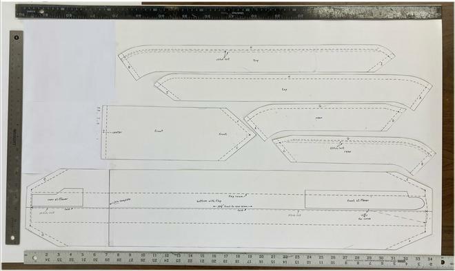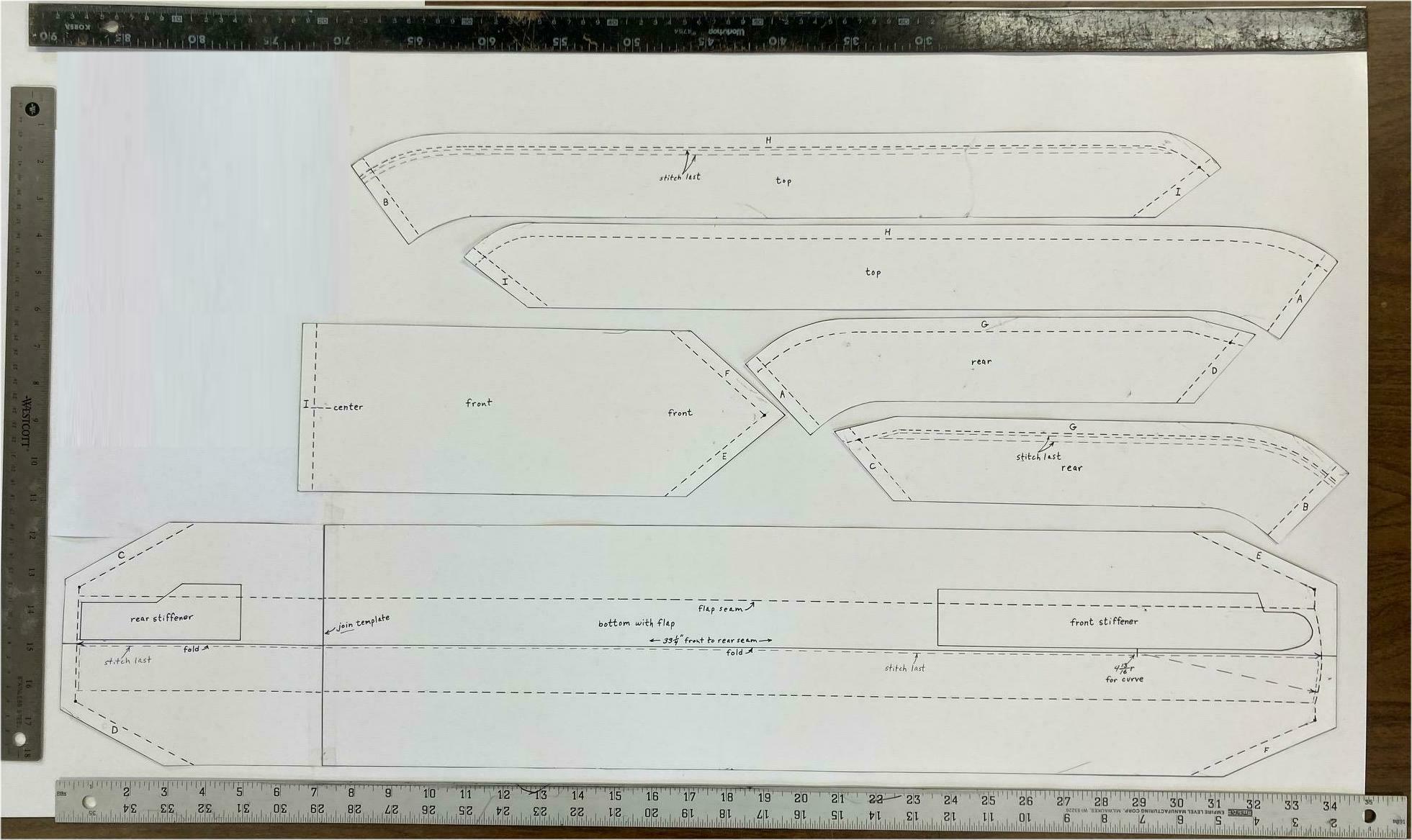 Draw the 3/8 inch seam lines on the back of the vinyl pieces to guide the sewing. Assemble all the parts inside out, sewing through the backing with the vinyl surfaces face to face. Sew to the corners and back stitch so it won t unravel. All the 3/8inch seams are done this way. Then trim all 3/8inch seams down to1/16-1/8inch after stitching except for G and H which gets trimmed to 1/4inch to help form the raised ridge across top and rear.