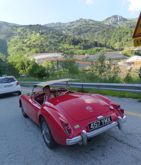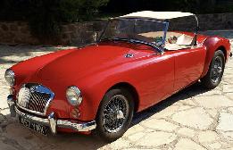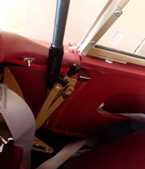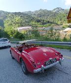 In October 2021, during a club tour in southern Penstlvania, I found two MGA with similar Bimini tops. This one had a pair of interesting side mirrors that are attached to the wind wings via a large suction cup. I guess they just get folded in if you want to use the rag top and side curtains for inclement weather.