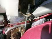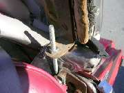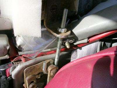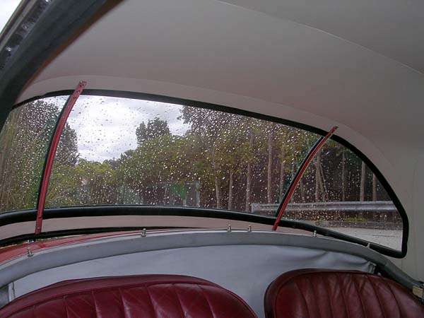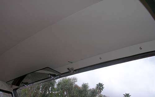 Little wood shims keep the top spaced properly while I await proper J-hooks and rear clips. Also waiting for replacement windows for the sidecurtains.