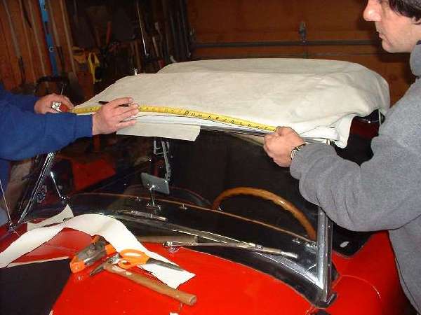 Before you go any farther, check the alignment of the fabric to see if it is indeed on center over the windshield. At each front corner, pull the fabric tight and measure from the fore & aft stitched seam to the side of the windshield. You should have the same distance on both sides. If not, subtract one distance from the other, divide by 2, and move the centerline mark over by that much. Then pull out the staples, relocate and stretch the fabric, and staple it back on to the header rail again. Repeat this process as necessary until you get the fabric centered at the top of the windshield.