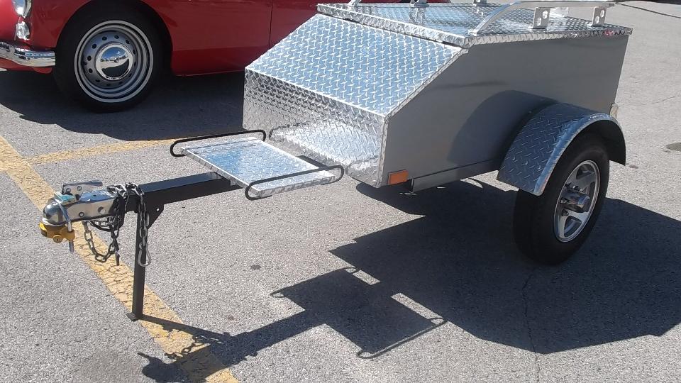These pictures were taken at NAMGAR GT-40 in Frankenmuth, Michigan, in June 2015. I could not find a manufacturer's name on the trailer, and I did not find the owner. While the hitch coupling is labled for 2000 pound capacity I don't know about the suspension capacity. With 12-inch tires it may possibly hold up to 2000 pounds loaded weight (although you wouldn't want to tow that much weight regularly with your MG). I believe the shiney diamond plate metal is polished aluminum, not steel.