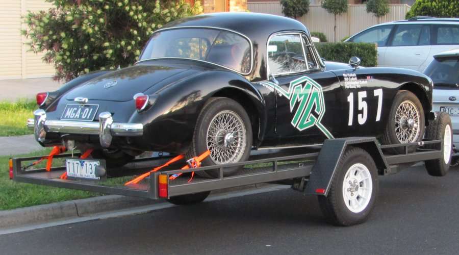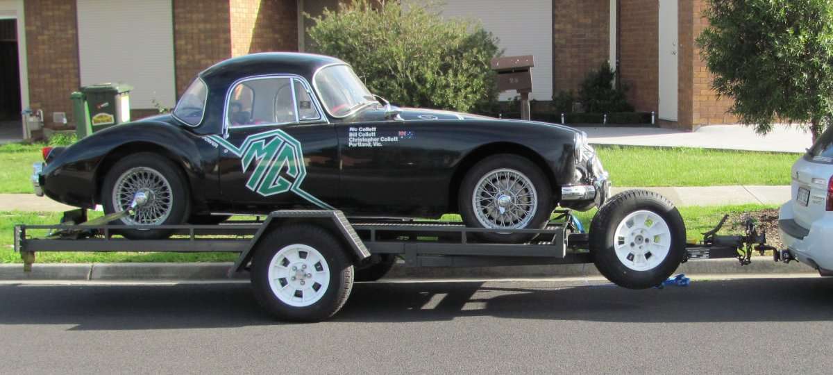 It strikes me that the carry try is minimal width for the MGA (or other small sports car), even though this car has slightly wider tires then standard. The tray plates are wider inboard than necessary, could carry a much smaller car, narrower wheel track than even MG Midget. If the whole trailer was about 2 inches wider it could carry a larger car, like an MG ZA/ZB Magnette for instance.