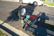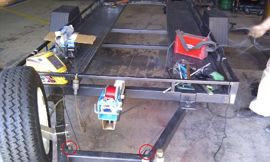 I have put red circles around the tie-down points I use. A tow hook or ring on the car near the diff would make it easier. Note: I have removed the number plate from where it was, after hitting it twice! The tray (load bed) is just a little too short behind the axle. i.e. as you drive on, the front wheels cross the trailer axle before the back wheels touch the tray, so it will start to flip up and bang the bottom of the car if you are moving slowly. My last mod will be to extend it about a foot somehow.