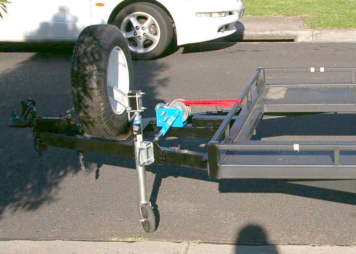 Photos above left and center show configuration before and after relocating the jockey wheel, winch and spare tire. Photos above right and three below show the configuration with the car being loaded. Notice that the entire trailer bed and chassis tilts. The only part that does not tilt is the triangulated hitch bar that holds the spare tire carrier and tongue jack. This requires the trailer to be hitched onto the tow vehicle while you are loading or unloading the car (most common).