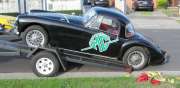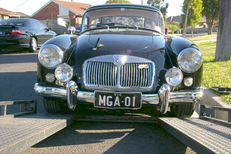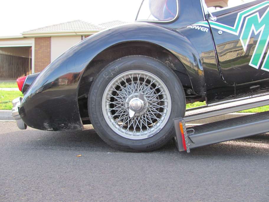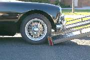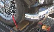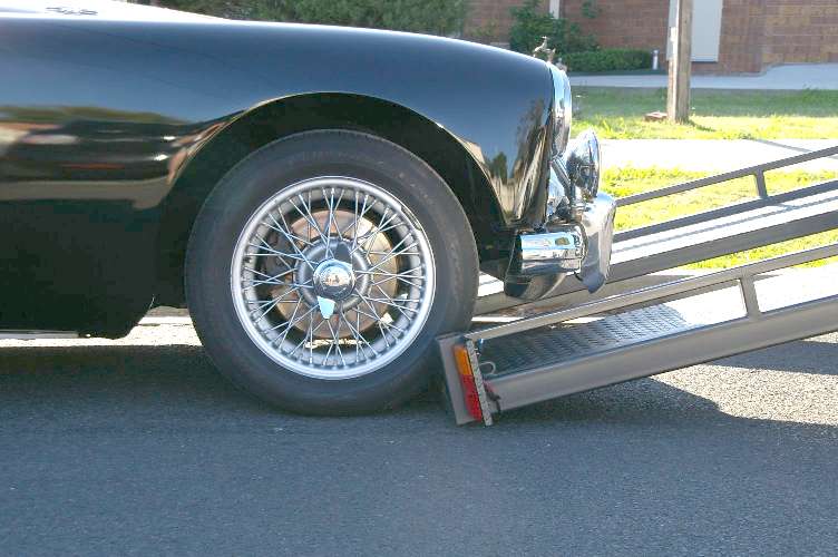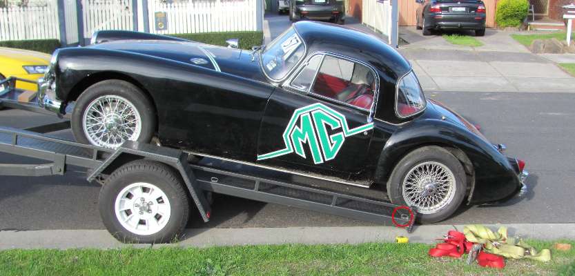Photos above and below show the car in transport position with tie-downs. The trailer center mounted license plate bracket will fold down flat during loading or unloading. The MGA doors open about 280-mm (11-inches) above deck level (with standard tires), so the doors can open above the trailer fenders (just), as long as you didn't eat too much for breakfast). It clears easily when the car is empty, only just when a 95kg (210-LB) driver is sitting in it.