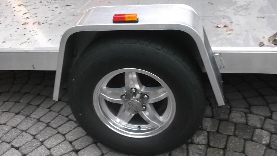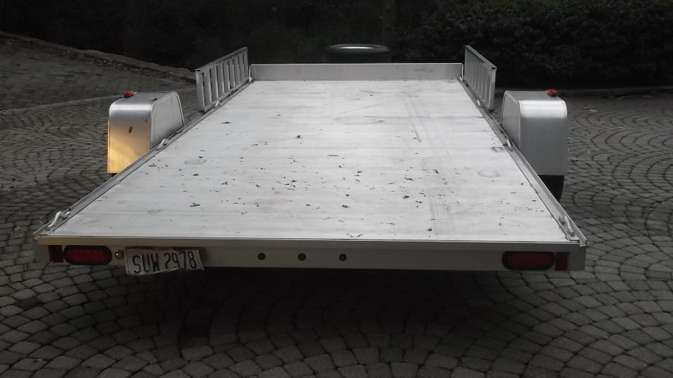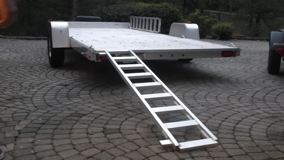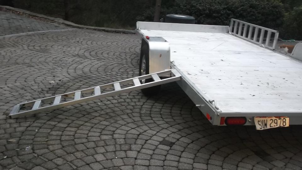 Aluminum frame, floor, fenders, wheels and ramps. LED lighting. Made by Aluma in Bancroft, Iowa, USA, this trailer is very light weight, something like 600 pounds without brakes, somewhat more fully equipped. Check the Aluma web site for details.