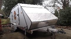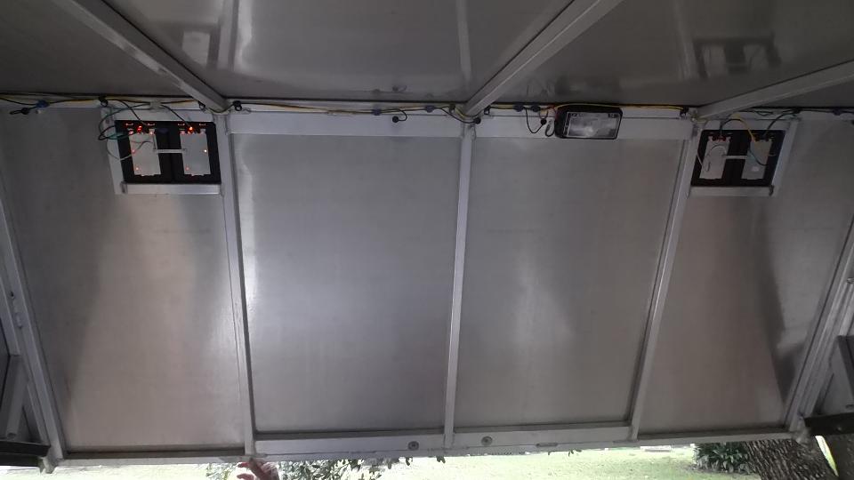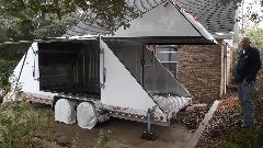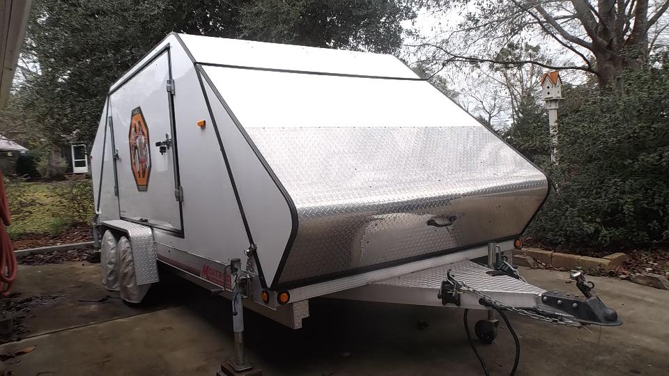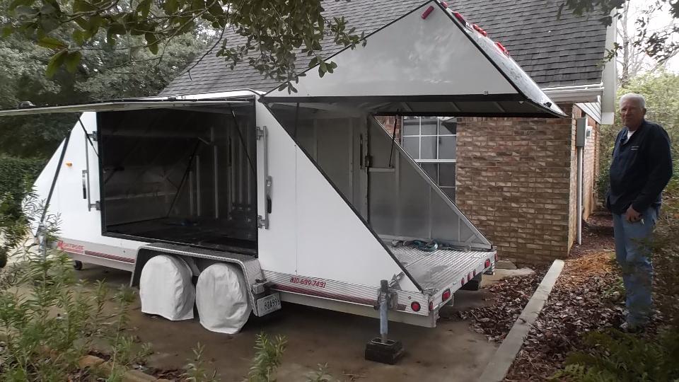 Gene Gillam in Saucier, Mississippi has this very nice all aluminum box trailer with aerodynamic tapered ends built by Montrose Trailers. It has 18-foot bed and opening hatches on four sides (easy access to tie-downs and car doors), and it weighs only 1800-pounds empty. It leaks a bit around the top of the front hatch door, but that should be fixable. It also has interior lighting, 4-corner stabilizing jacks, roll-about hitch jack, and electric brakes. I ducked to step in, and then it is stand-up height for me (barely), but then I'm only 5'-6", and taller folks would have to duck inside.