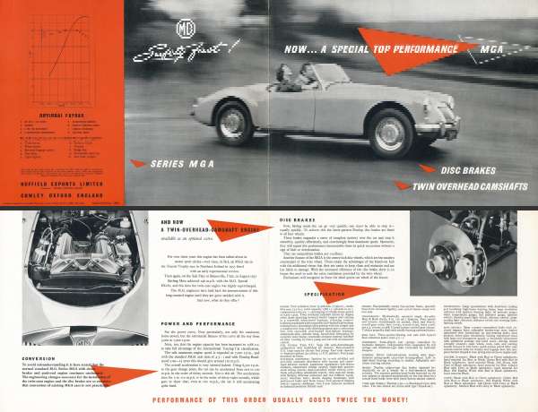 Printed by The Nuffield Press, April 1958. This was prior to the July 15 Press Demonstration Day and public release date for the MGA Twin Cam. This brochure was included in the Demonstration Day information package.