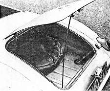 With the hood and side curtians erected, the car proved weatherproof except at speeds over 90 m.p.h., when the wind pressure tended to lift the hood above the middle of the windscreen; rain found its way in there, and also through the scuttle on the passenger's legs. Although there were gaps between the windscreen frame and the side screens, rain did not penetrate here. The hood is comparatively simple to erect and can be folded away neatly behind the seat backrests. A plastic bag, secured to the bodywork behind the seats, provided stowage for the side curtains.
