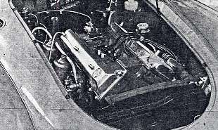 Powered by the twin carburettor version of the 1-1/2 litre B series engine, the standard MGA coupe is capable of slightly more than 100 m.p.h.; the new 1,600 c.c. unit gives teh open car, with hood and side screens in position, a maximum of 114 m.p.h. It is faster than the 1-1/2 litre car by 1.7sec to 60 m.p.h., and by 15sec to 90 m.p.h.