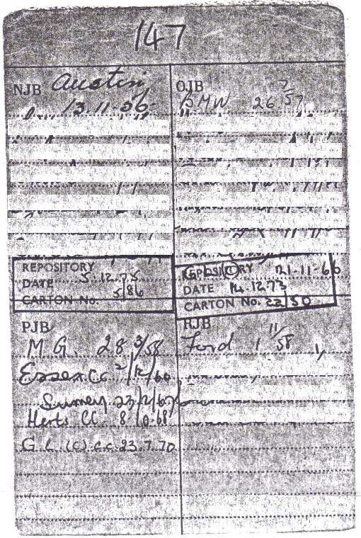 Addendum, 1/23/07: The following document came from a request to the Kithead Trust in UK, as DVLA did not have any records for this car pre 1981 when they went computerised. Not all the local counties decided to hand over their old records and apparently some counties even destroyed theirs. (Names of owners of other cars on the same card have been obscured).