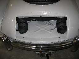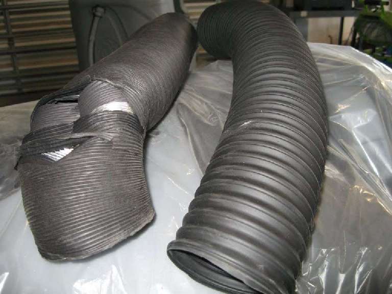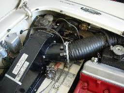 >>Two hoses, commercially available type on left (black paper over thin corrugated alumunum), the organ tubing on right (black vinyl over PVC spiral band). | |  >>Organ piping in place. This ended up being a very nice fit and it looks right. (The left mounting strap was not bolted down, so it is out of place). |