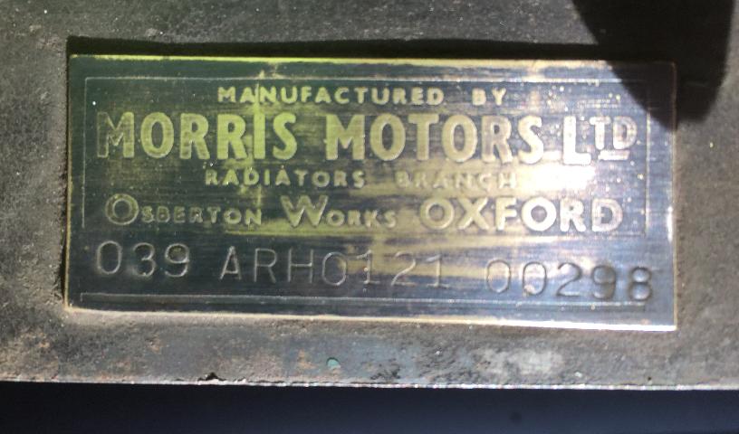 This is the number tag attached to an original MGA Twin Cam radiator. (Photo compliments of Neil Burnside). The part number as found in the Service Parts List is ARH121, but may be stamped on this plate as ARH0121. "039" would be the production date, 3rd week of 1959, while trailing digits (00298) would be a serial number. This is the same (blank) plate as used on radiators for early MGA pushrod engined cars (see article CO-100), just the different part number stamped for the Twin Cam radiator.