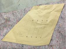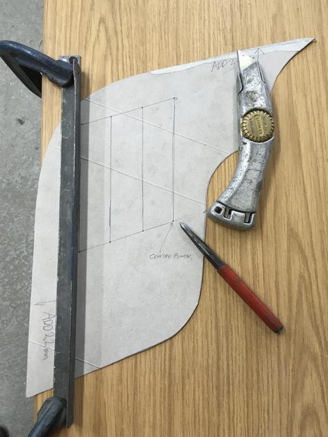 The scores made in the material need to be deep enough to allow the sheet to split at that point, I had more than one or two that cut through which is ideal. They can be teased to open up enough to allow each one to locate over the underside of the vent as per the cardboard template in pic2. The top can be position by eye according to pencil marks at each side.