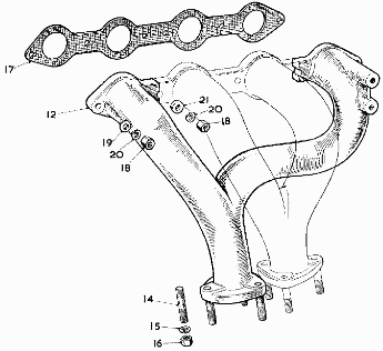 It is important to properly install the two straps that secure the down pipe to the bellhousing bolts. One strap alone is not sufficient. If these straps come loose the pipe will wobble about due to engine vibration and shake, and the pipe to manifold seals will be damaged causing exhaust leak. It could even cause fracture of the pipe or the iron manifold. As a side note, the exhaust ring seal is the same part number as is used for the pushrod engine MGAs.