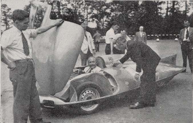 TIGHT FIT for six-footer John Bolster, who was privileged to drive the record-breaking M.G. Ex. 181 -- the fastest 1-1/2-litre car in the world -- on the occasion of the Press showing of the new "Twin Cam" M.G.A., described this week on page 79.