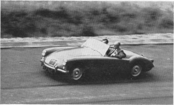 more or less normal driving technique -- much as used on the well-cambered bend -- but this corner goes on and on through about 150 degrees. There follows a short straight, on which it is possible to get into fourth gear before a swerve to the right, preceded by a bump which tends to throw the MGA sideways -- from which the car recovers most admirably -- and then a kink back to the left which marks the beginning of a long wide-radius curve, again slightly banked. This turn can be taken virtually flat out in third, thanks to the car's excellent road holding and responsive steering. At 6800 rpm a straight-through change into top induces very little clutch slip, and the car goes on accelerating through the long, long left-hand curve which leads back on to the circuit's one short straight. There is just time to get the speed up to 100 mph before braking and changing down for the first corner, and that's two miles in just under one and a half minutes, a figure which could be improved upon quite considerably upon further acquaintances with both course and car.