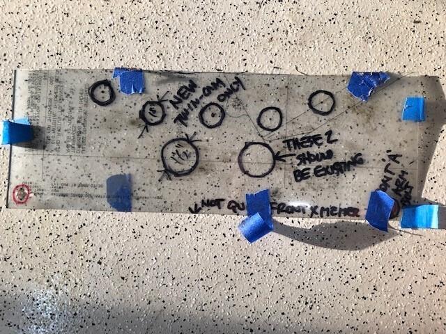 The top was a different story, as that was not parallel to the bottom. I had issues with trying to get a 1/4" drill to bite, as it wanted to wander. Secondly, I did not wish to drill 1 in. holes from the bottom, as they would appear as ovals on the inclined top surface. I was able to drill the 1/4" starter hole for the top center from the bottom. I then drilled it out from the top, resulting in a round hole. the remainder we drilled from the top using center-to-center spacing from the sump bolt holes, and maintaining angles. Measure 3 times, drill once. They appear to line up when looking straight down".