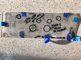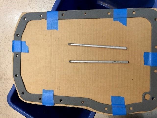 So you will see a second template, made from a sump gasket. I took 1/4 in. aluminum rod, cut them to 7 in. lengths, threaded one end, and then suspended the cardboard+gasket from the aluminum rods that were threaded into a few select sump bolt holes. This gave me the confidence to drill. I center-punched, and then drilled the bottom.