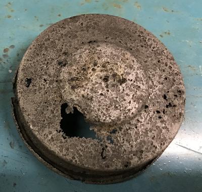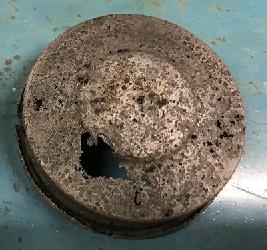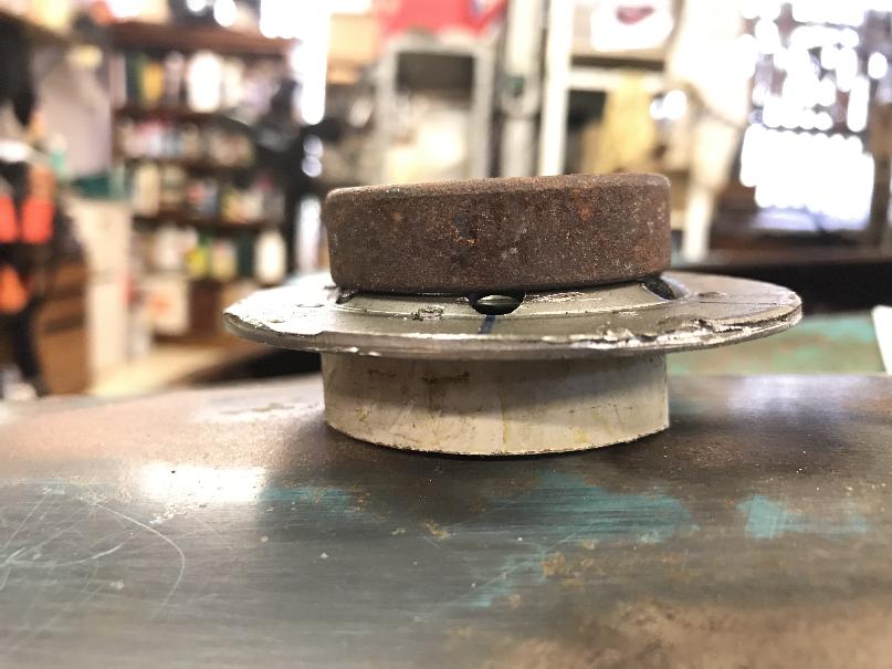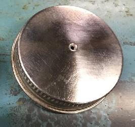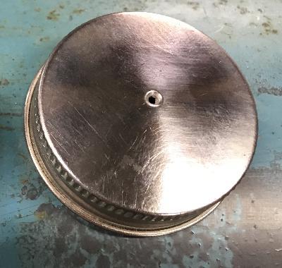 To press evenly on the cap, an old piece of outer bearing was placed on the outer flat of the filter base plate and a piece of flat plate (not shown) was put over this to take the force of the press.