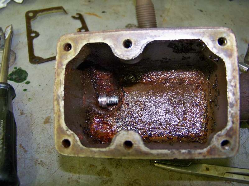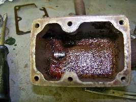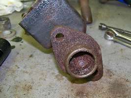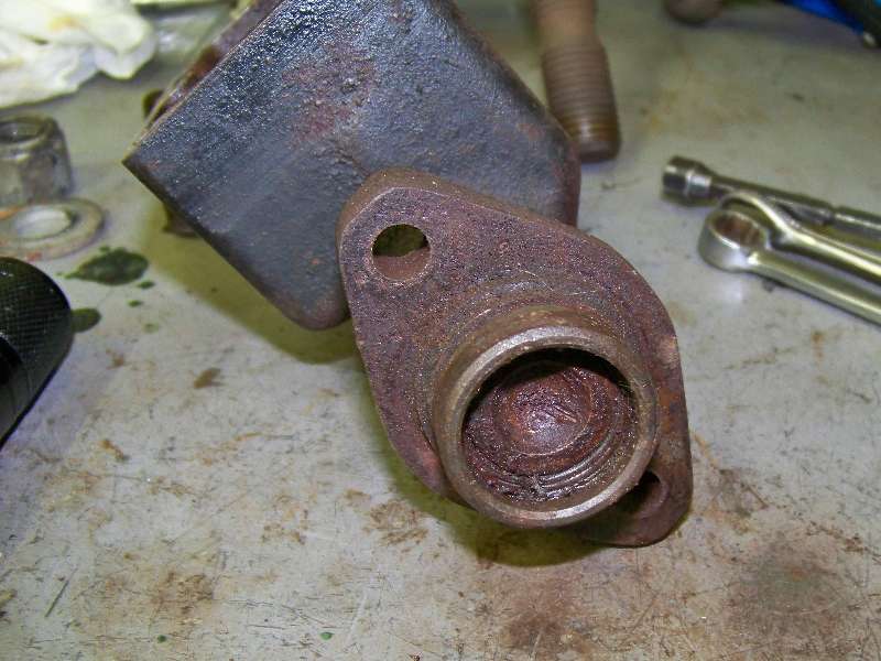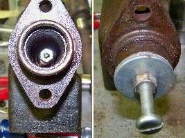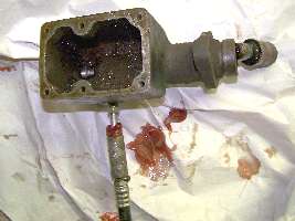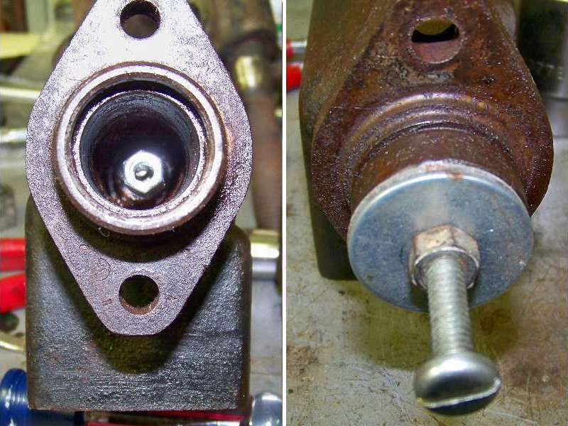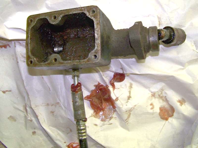 Illustrates the pumped out piston and no leakage past the screw plug. The Zerk fitting is simply screwed into a brake line fitting after the hole has been taped to the proper threads. Messy but quick and effective.