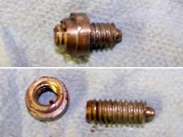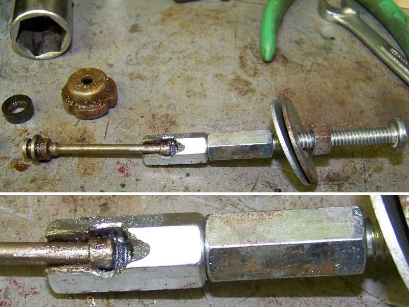 Right shows the puller in place. All that is necessary now is to hold the screw and turn the nut. Dan Suter's suggestion of using a wedge shaped wooded tool to just budge the alloy seat would very likely work in all but the worst cases.