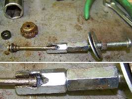 This is the tool to remove the pin and rear aluminum spring seat from the back of the cylinder. I could not get the seat to move by pulling on the pin. I made up this small puller from hardware store pieces that I had on hand. The stepped hole in the 1/4 x 20 hex coupler was made buy first making a slot lengthwise with an air cut-off wheel. A hole smaller than the end of the pin was drilled at the top. I then used a file and Dremel tool to shape the slot and hole to accept the pin shaft and end. The idea being the hole would hold the end and provide a way to build on the hex coupler to get a longer screw and a few back up washers to make a working puller.