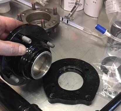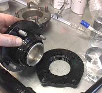Here is another picture of the Twin Cam rear caliper adapter plate with the Dust Cover press fit in the large center hole (again looking at the inboard side of the plate).