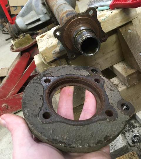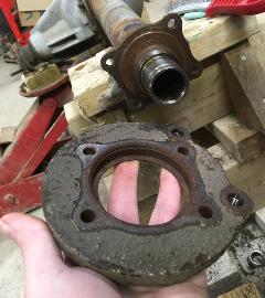 Here is a picture of the bearing hub and the adapter plate, which appears to have the dust cover installed (viewing the inboard side of the plate). The problem is, a lot of cars seem to be missing this part, lots of people don't realize it is supposed to exist, parts suppliers do not have this part, and apparently no one notices any problem if it is missing. If it is indeed a drip redirector, then I would recommend that you try to include it in the assembly.
