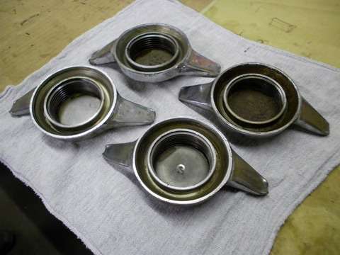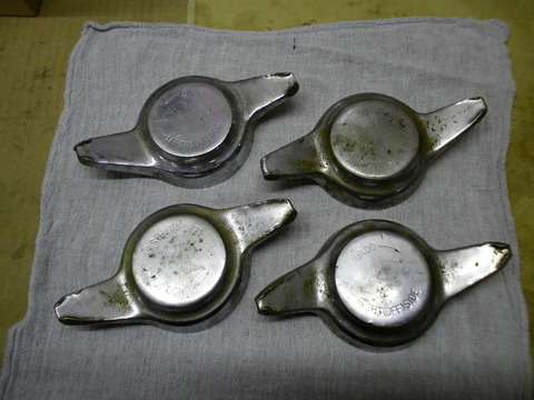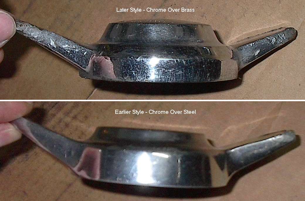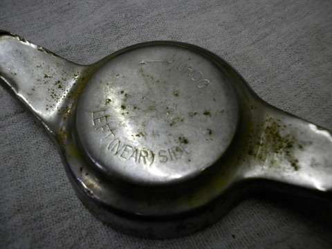 "As you can see when they are re-chromed, most of the lettering disappears. (See photo at right). This was a particularly bad example but I instructed the chrome plater to leave as much of the engraving as possible (so he did not finish the faces) so at a later date they could be re-engraved. Thus the way forwards appears to be either purchase new or have the chrome removed, then get them re-engraved, then back to the plater again. Shame they were not more heavily stamped in the beginning".