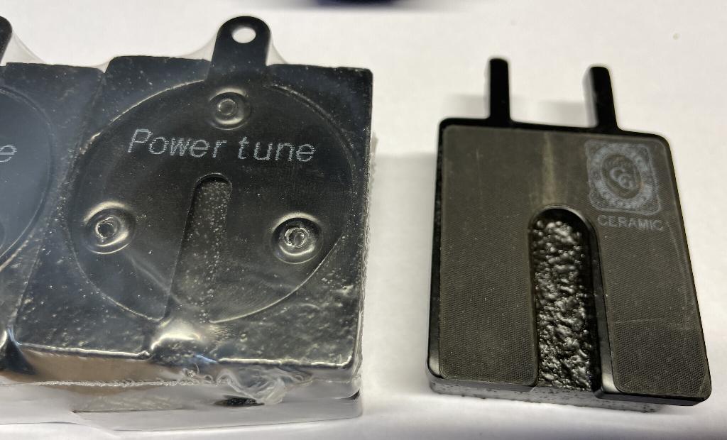 "Last year I got a set MINTEX brake pads from Bob West, and they had the same sort of slot like ceramic type on the picure. They work fine, do not chatter and are much easier to install and remove. On top of that these MINTEX pads do have super brake performance compared to my previous pads". -- Gert