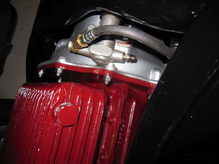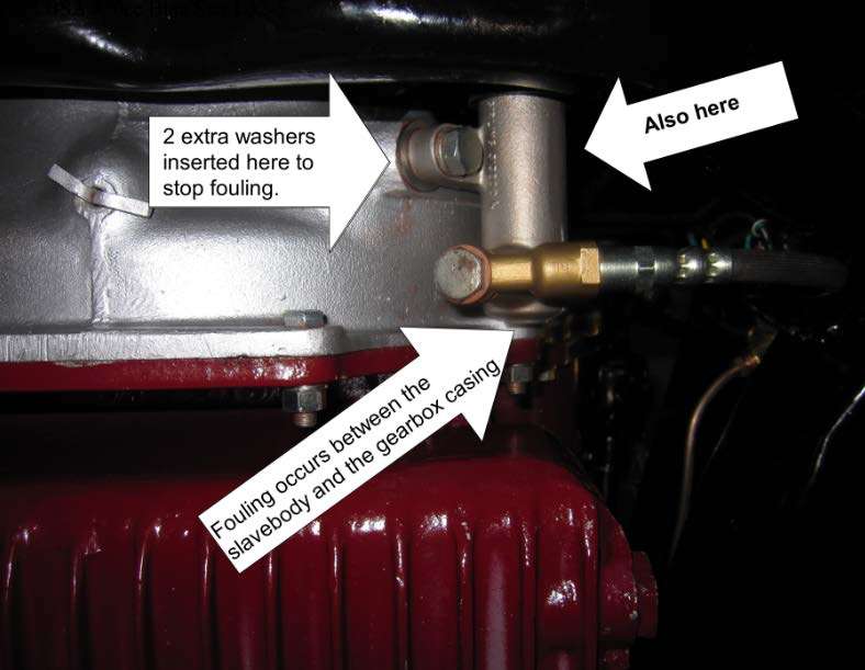 Here is a photo of the “County” reproduction slave cylinder fitted to an MGA Twin Cam. Note the 15mm of spacers required to stop the longer slave fouling the gearbox casing. Grinding the rear of the County casting can reduce the number of spacers required but it’s very difficult to get the center line of the pushrod back to standard with this product.