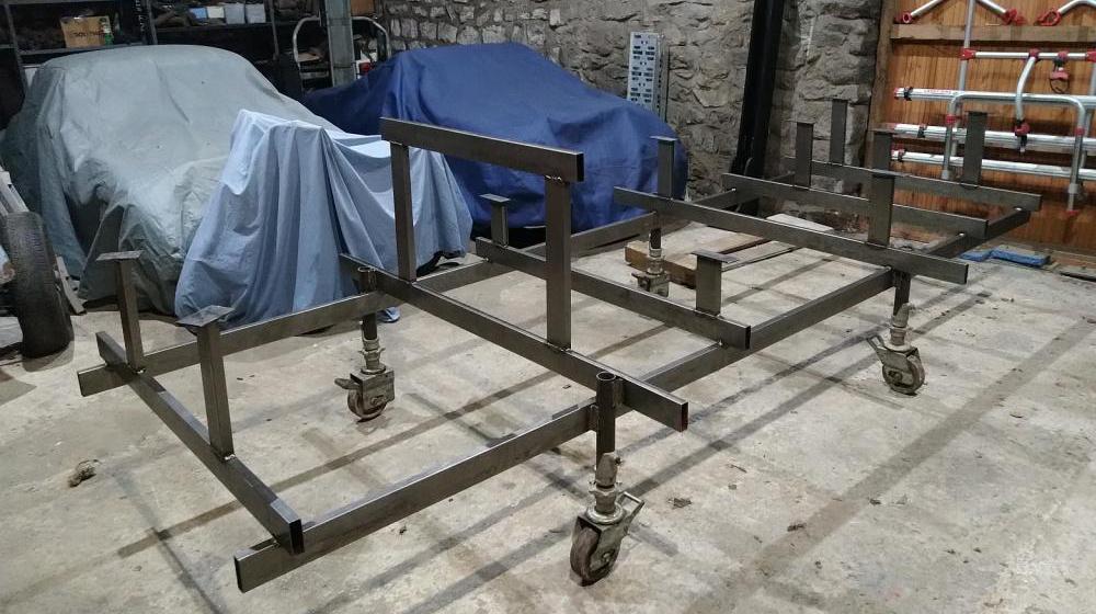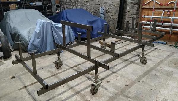 I welded round tubes onto the frame to accept some old scaffolding casters so moving the whole thing round is easy, the separation of the longitudinal members was determined by the dimensions of my trailer so the casters were spaced to run straight up the ramps and onto the trailer. Flat plates for bolt on casters would work equally well. Two cross tubes are wider than the others so I can use them as lifting points, ropes outside the body line.