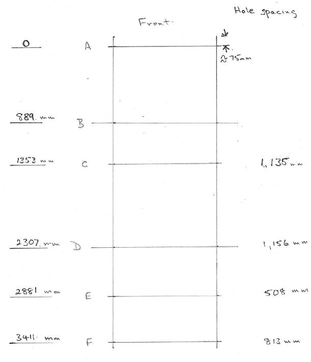 Next cross tube (C) picks up on the brackets in front of the doors, vertical tubes 175 mm, c/l of verticals 1010 mm, holes outside, c/l of holes 1,135 mm. Cross tube 1,353 mm back from A.