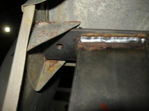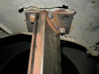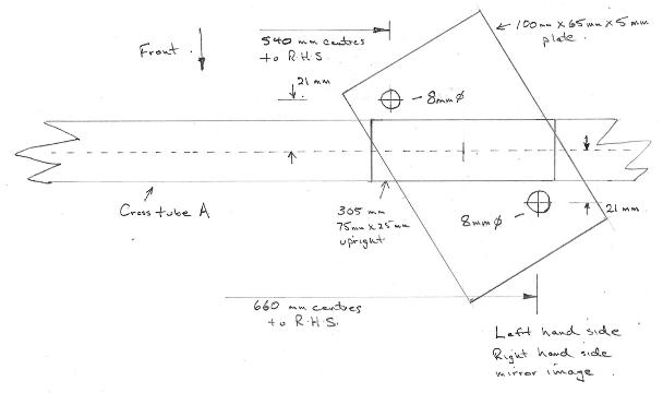Front cross tube (A) picks up on the body mounting holes through radiator duct panel which match up to the holes in the chassis extension. Centre line of A is taken as the zero datum for longitudinal measurements. Weld A around 75 mm back from the front end of longitudinals, exact position is not critical, but all other dimensions are measured from the centre line of A. Verticals are 305 mm, separation of verticals (at centre line) is 600. Drill plates to match the chassis extension after welding to upright, plates angled out by 30 °as sketch below. Exact position is not critical, but it must be inside the outer rear corner of the upright to clear the inner wing/radiator duct panel flange, centered up is about right. This is the only fiddly one! Photograph and sketch both of left-hand mounting point.