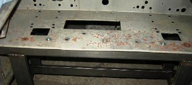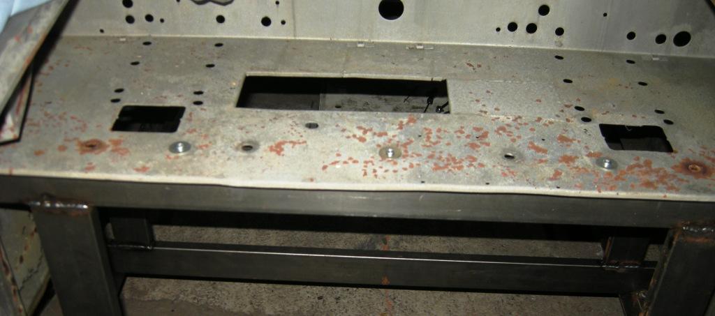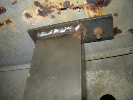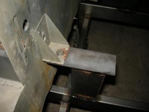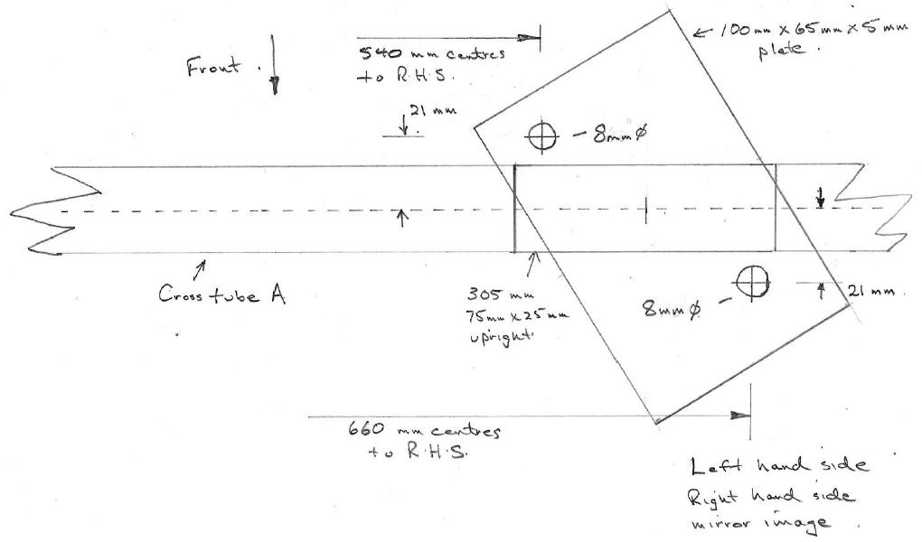 Next cross tube (B) does not have plates but has a transverse 950 mm long piece of 25 x 75 tube on top of the verticals on top of which the scuttle/heater panel sits. Verticals 467 mm, c/l of verticals 775 mm. 889 mm back from A. If you can’t get 25 x 75 tube, the length of these verticals must be adjusted, if the tube you can get is more than 75 mm wide decrease the length by the extra width of the tube you get or vice versa. Similarly, if your steel strip isn’t 5 mm thick, if you get thicker reduce the verticals by the difference.