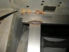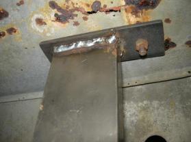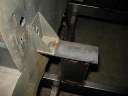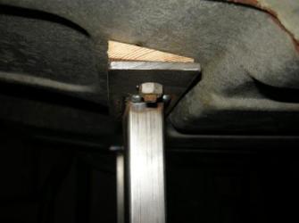 Next cross tube (E) picks up on the two mounting holes in the middle of the boot (trunk) floor, you will need to make some small wooden wedges as this panel is not level, dimensions are not on the workshop manual frame diagram, getting the steel work accurate would be difficult. Easy by making some wedges! Verticals 300 mm, c/l of verticals 383mm c/l of holes 508 mm. Cross tube 2,881 mm back.